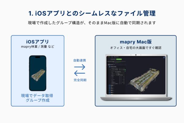 Apple IDまたはGoogleアカウントを用いたサインインに対応。「mapry林業」や「mapry測量」などのiOSアプリ内で作成したフォルダ(グループ)や点群データの管理構造が、そのままMac版にも同期されます。現場でスキャンしたデータをクラウド経由で直接ダウンロード・表示できるため、煩わしいファイル転送の手間が不要です。