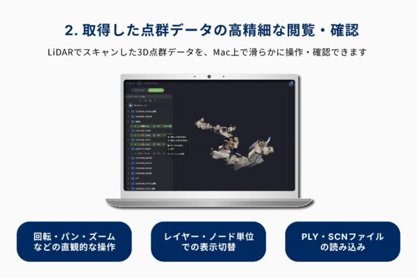 大容量の3D点群データをMac上で滑らかに閲覧可能です。回転・パン・ズームといった直感的な操作に加え、「レイヤー・ノード単位での表示切替」機能を搭載し、専門的な分析のプレビューにも最適です。また、Mac内に保存されている点群ファイル(PLY・SCN形式)の直接読み込み(ドラッグ&ドロップ対応)や、複数ファイルの同時表示にも対応しています。